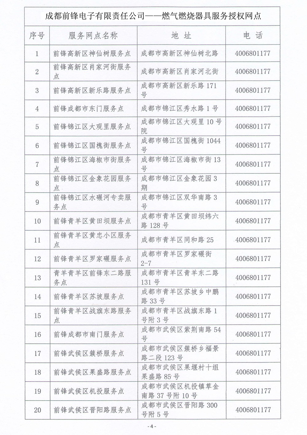 成都前鋒電子有限責(zé)任公司 燃氣燃燒器具服務(wù)授權(quán)網(wǎng)點總覽