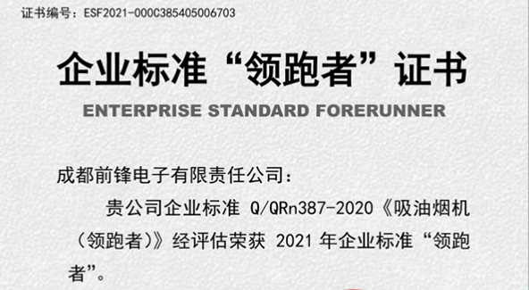 近日,由中國標(biāo)準(zhǔn)化研究院主辦的《2021年全國企業(yè)標(biāo)準(zhǔn)領(lǐng)跑者榜單》發(fā)布。成都前鋒電子有限責(zé)任公司生產(chǎn)的前鋒牌吸油煙機CXW-200-L803 榮獲企業(yè)標(biāo)準(zhǔn)《吸油煙機(領(lǐng)跑者)》殊榮。